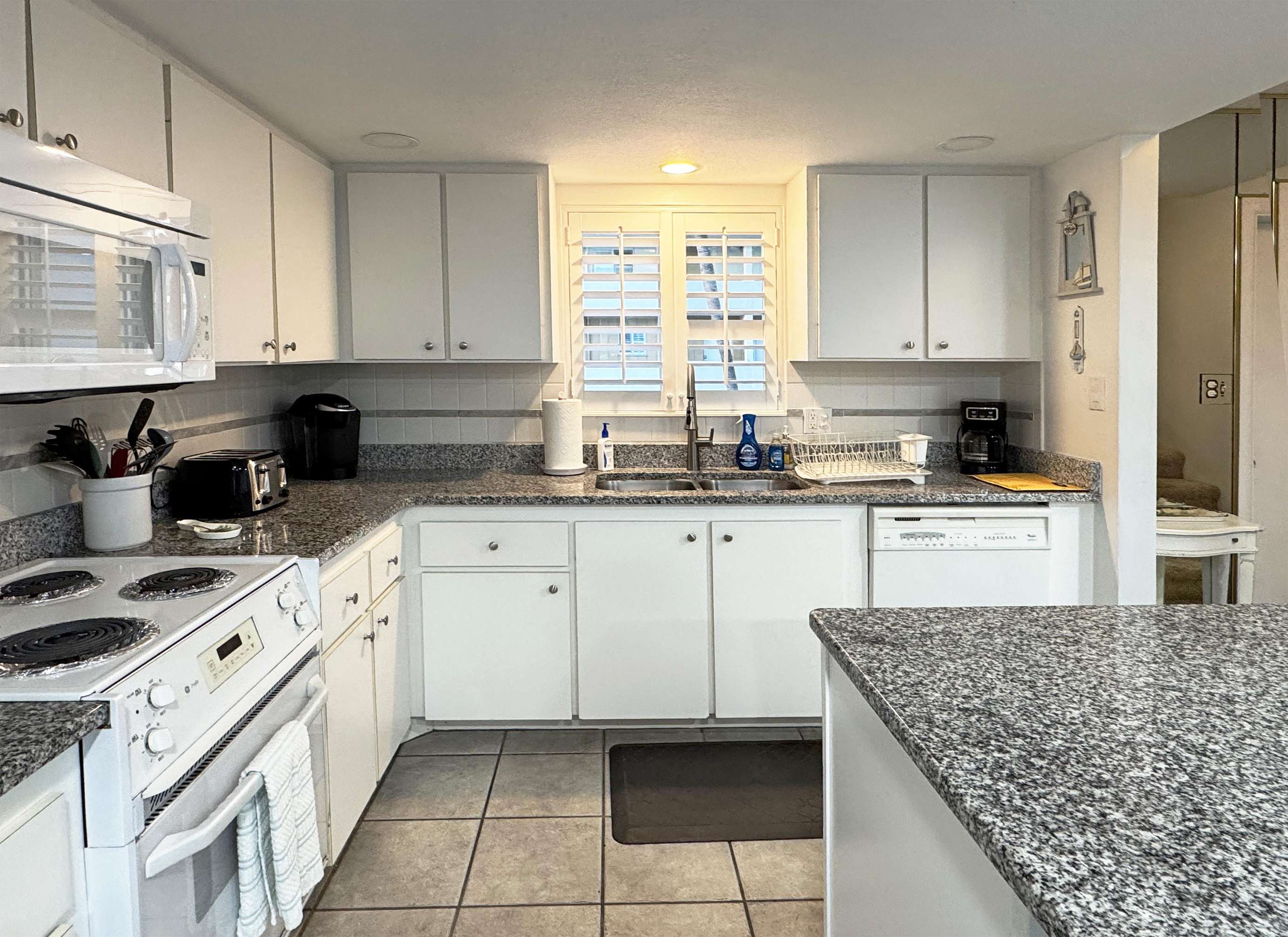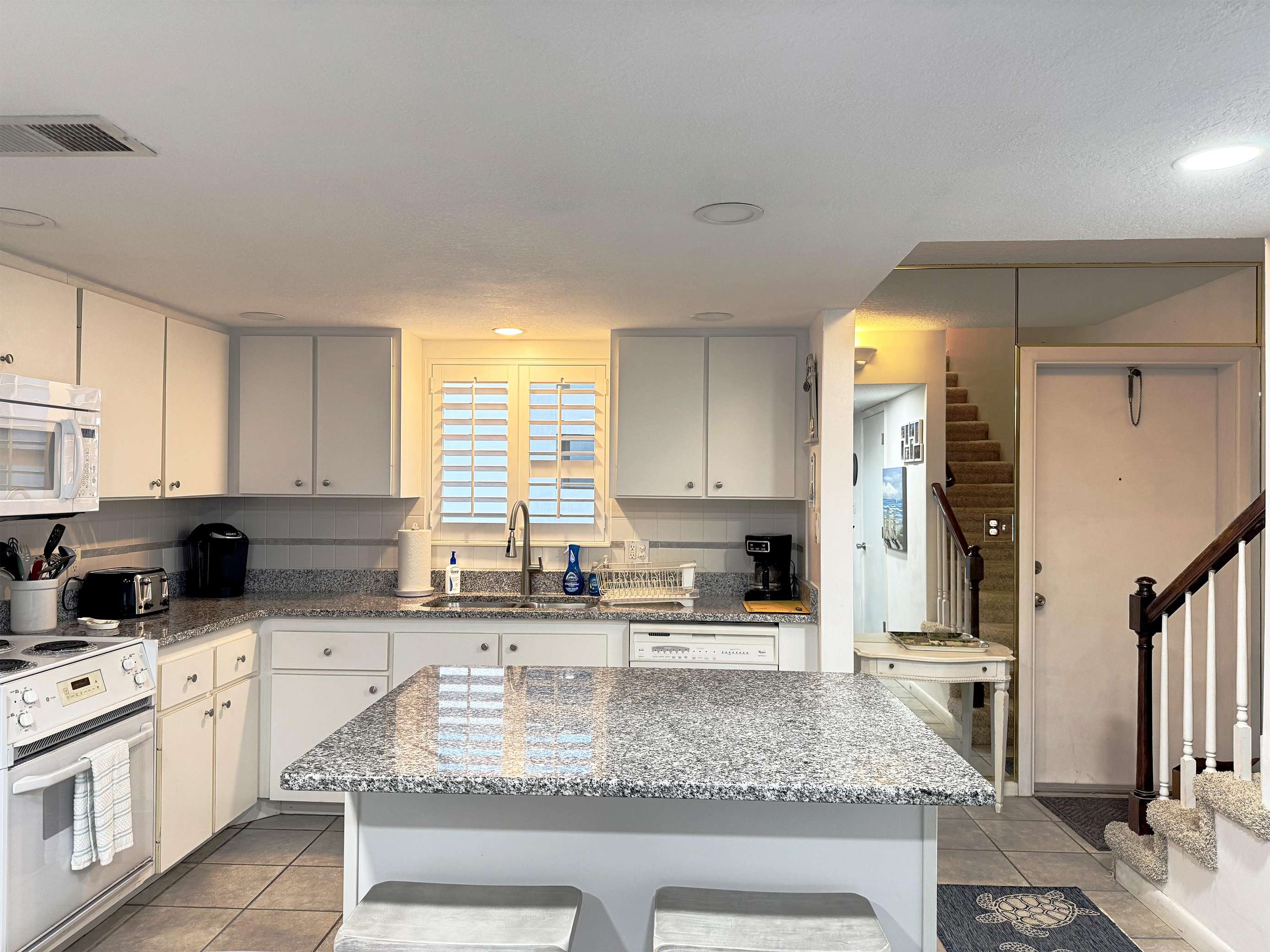 Bright, spacious kitchen with granite island and modern appliances