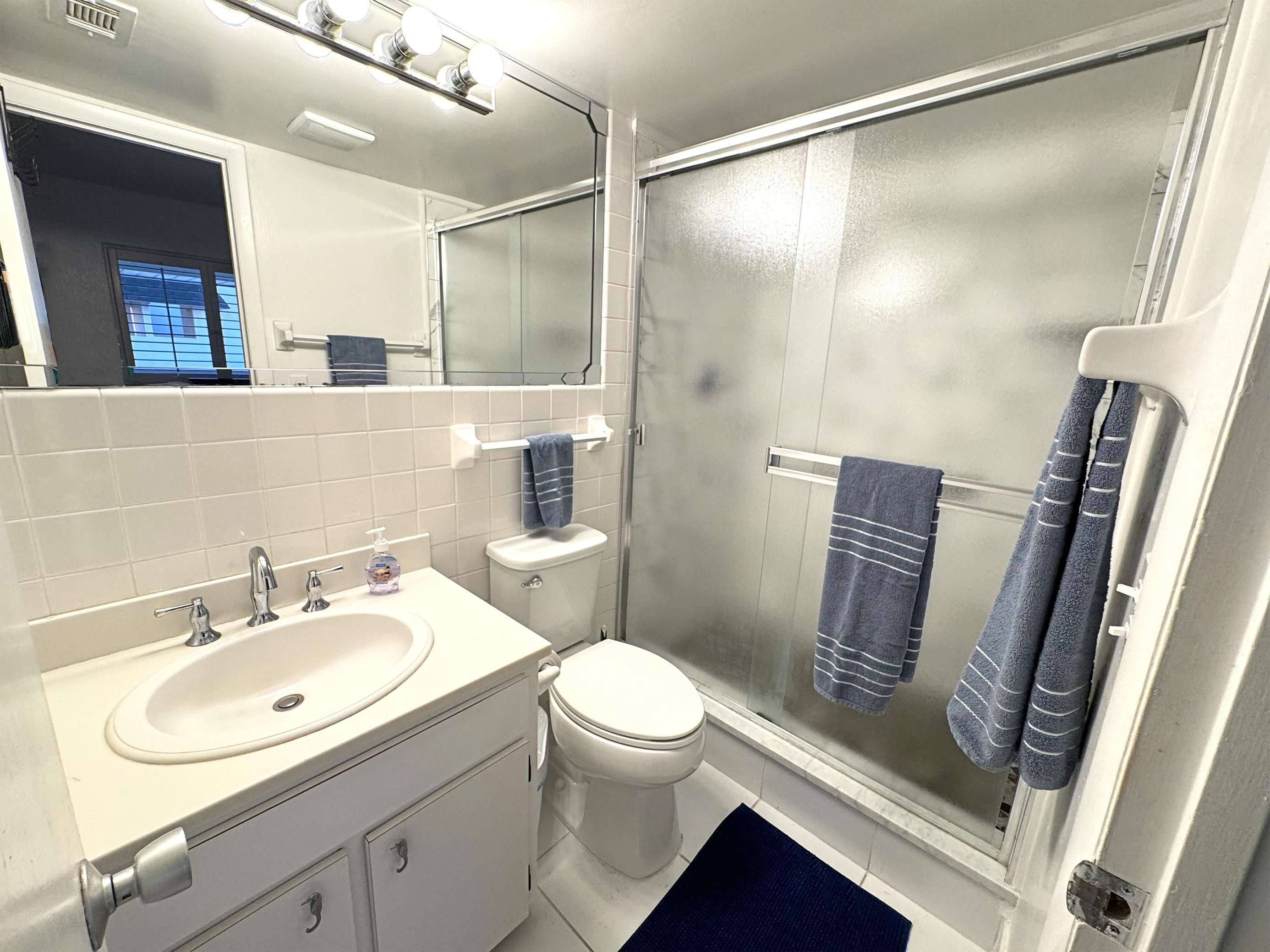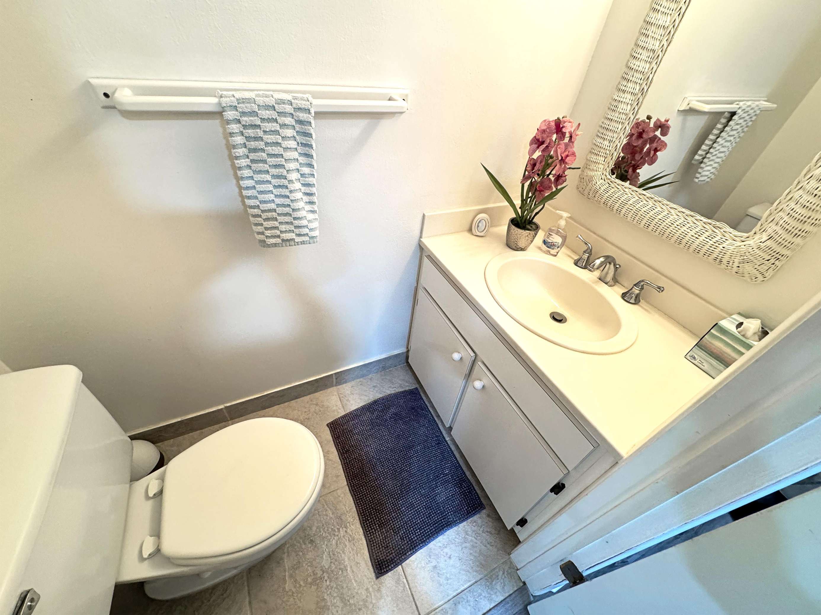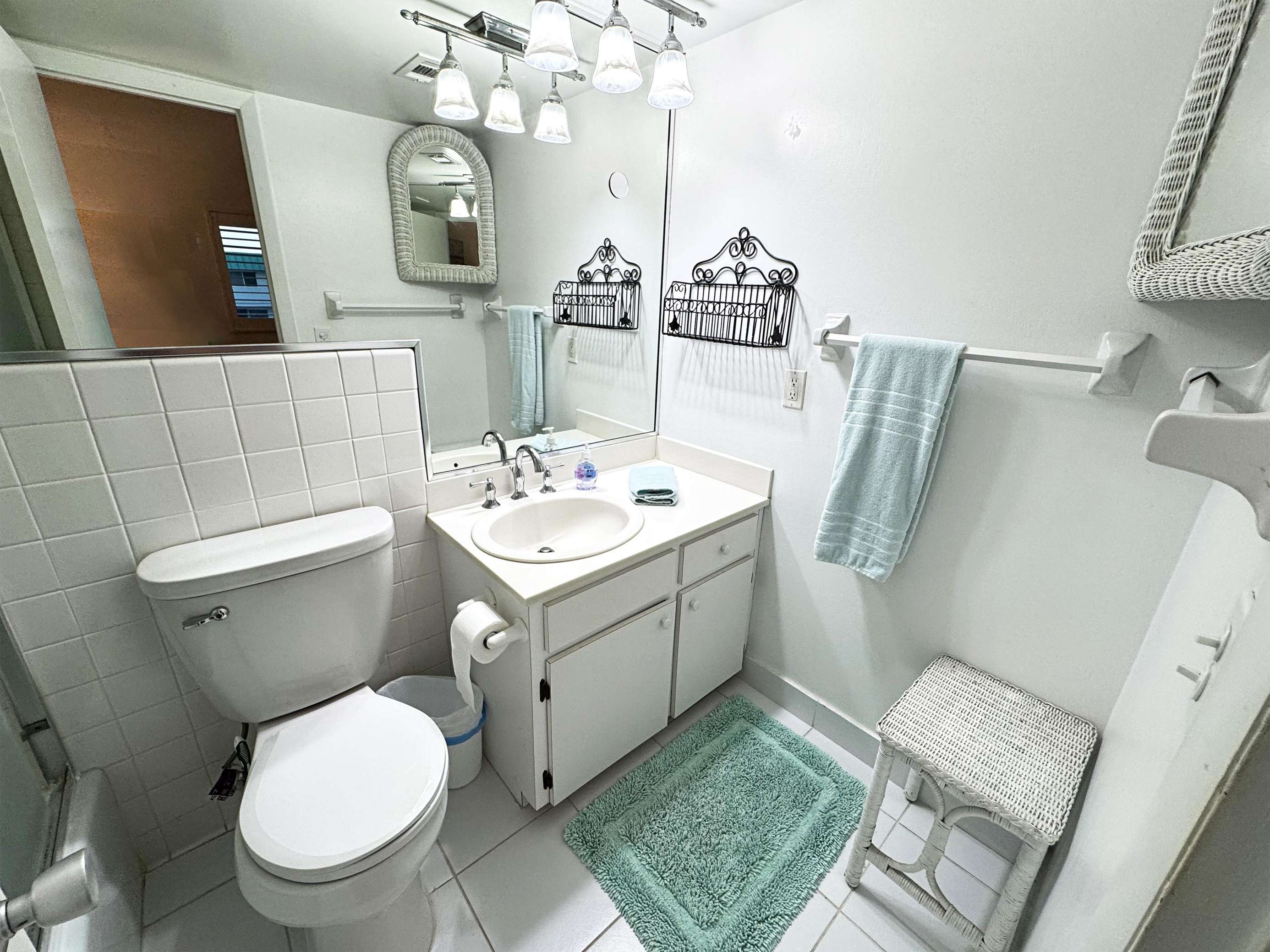 Bright, clean bathroom with modern fixtures and cozy accents