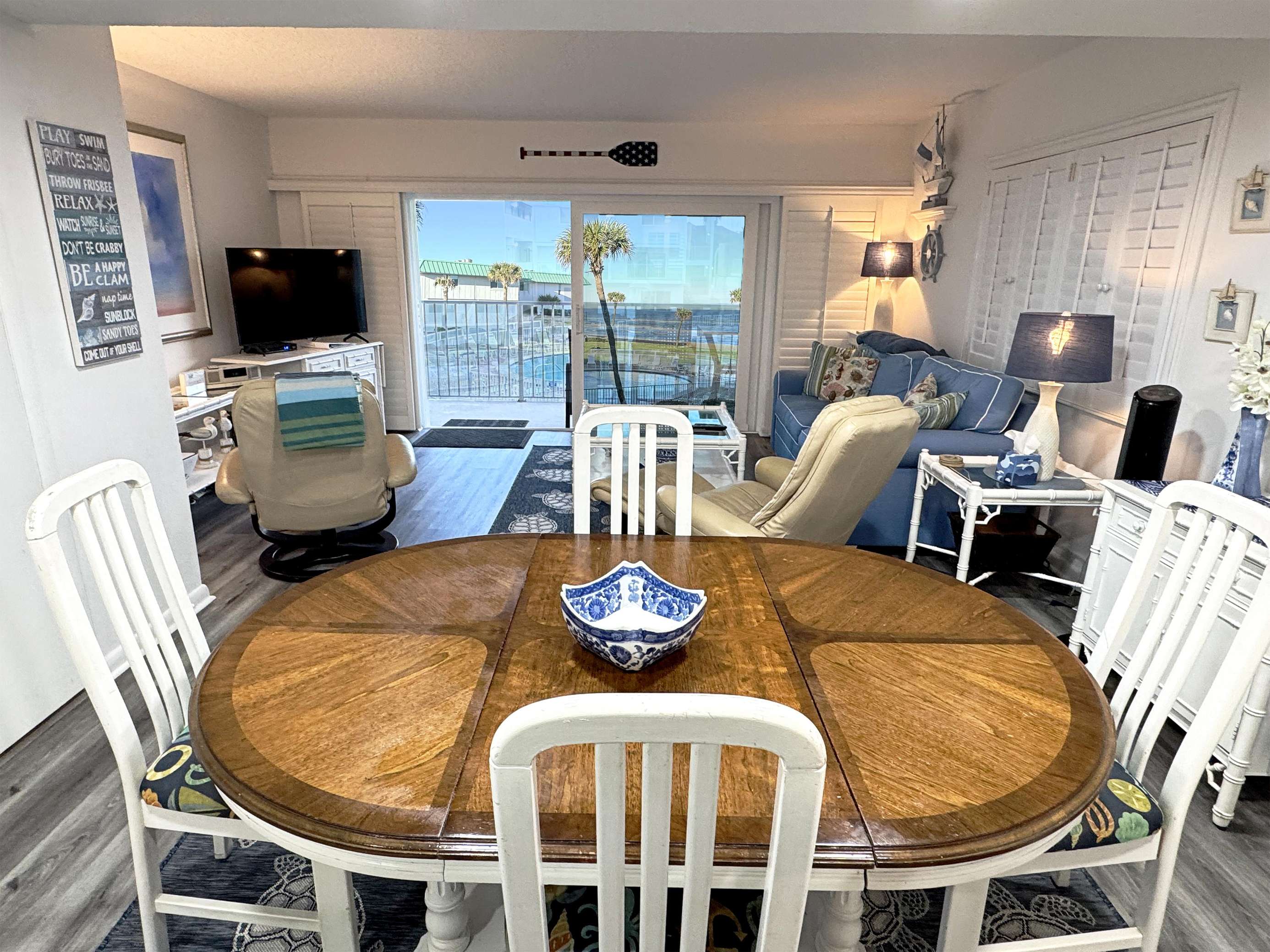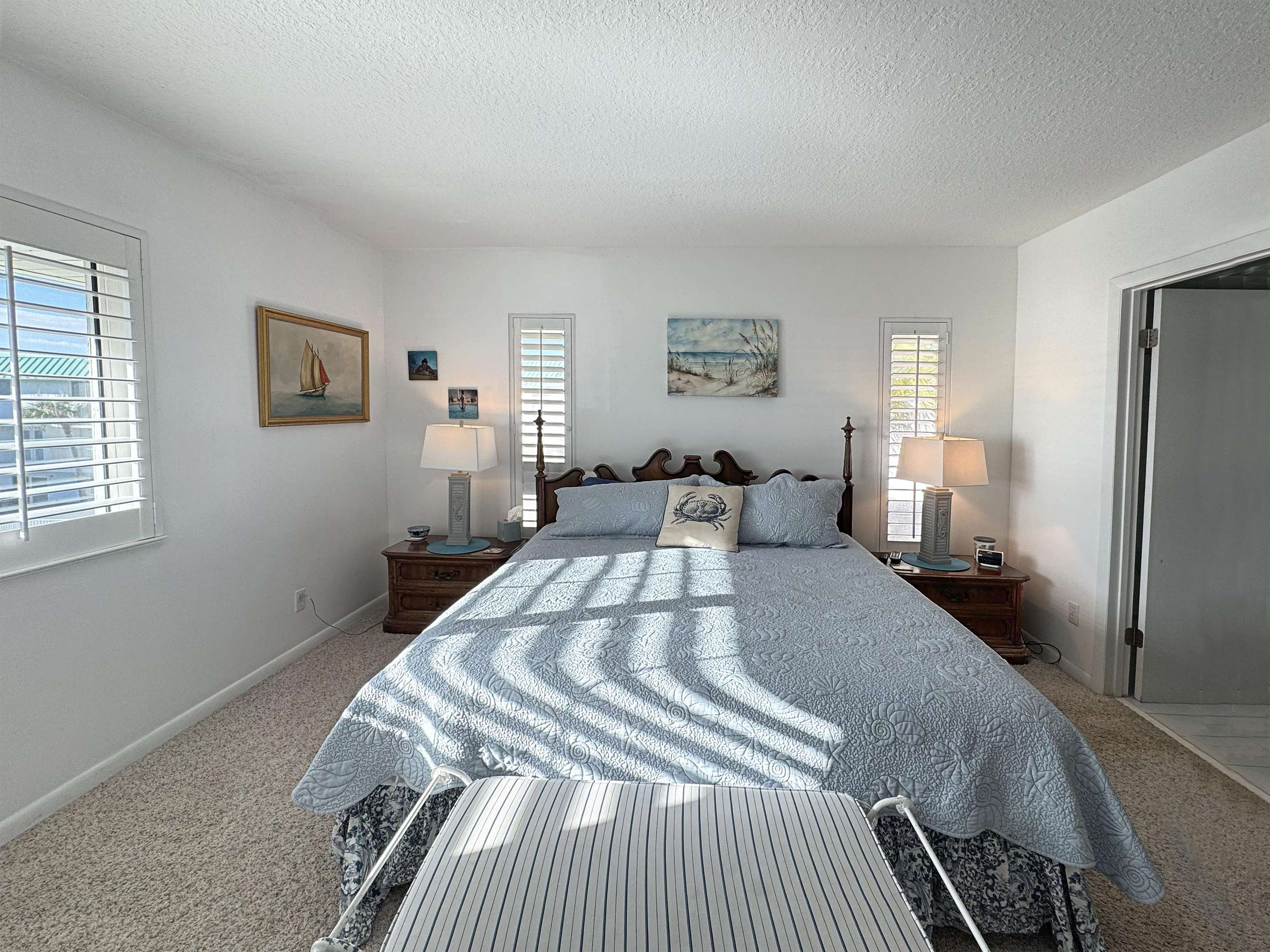 Beautiful Beachy Blues decorate this charming 2 bedroom 2 1/2 bath townhome style condo. Downstairs offers a recently remodeled kitchen with all the necessities, a dining room, a 1/2 bath, a living room, and access to your all-day sunshine balcony. Upstairs you will find 2 ensuites. The master bedroom offers a king-size bed with a tub/shower combo bathroom. The guest bedroom offers a twin bed and a full bed; the private bathroom offers a walk-in shower. Fully furnished with all necessities for living at the beach!!