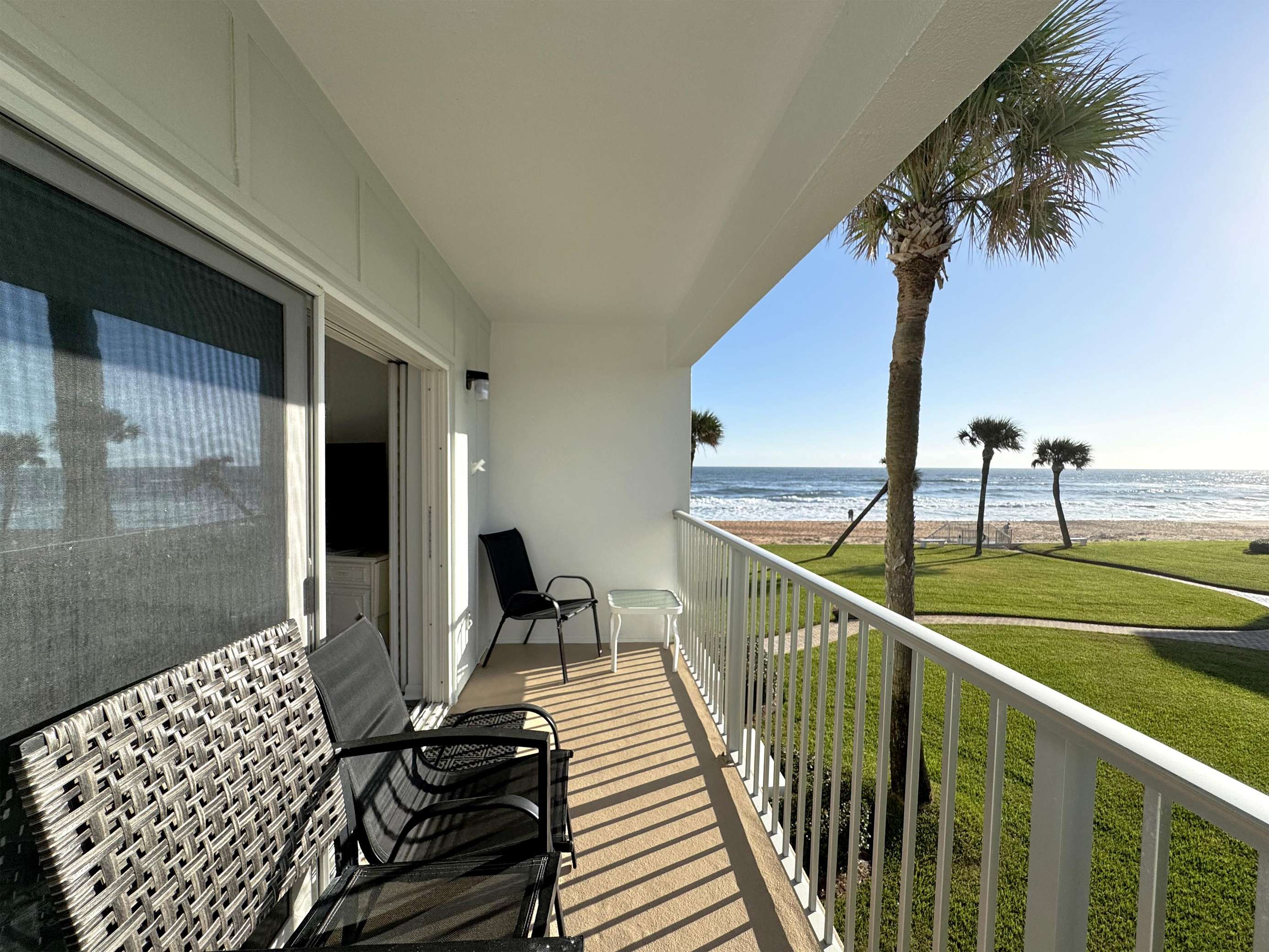 Oceanfront balcony with cozy seating and stunning views