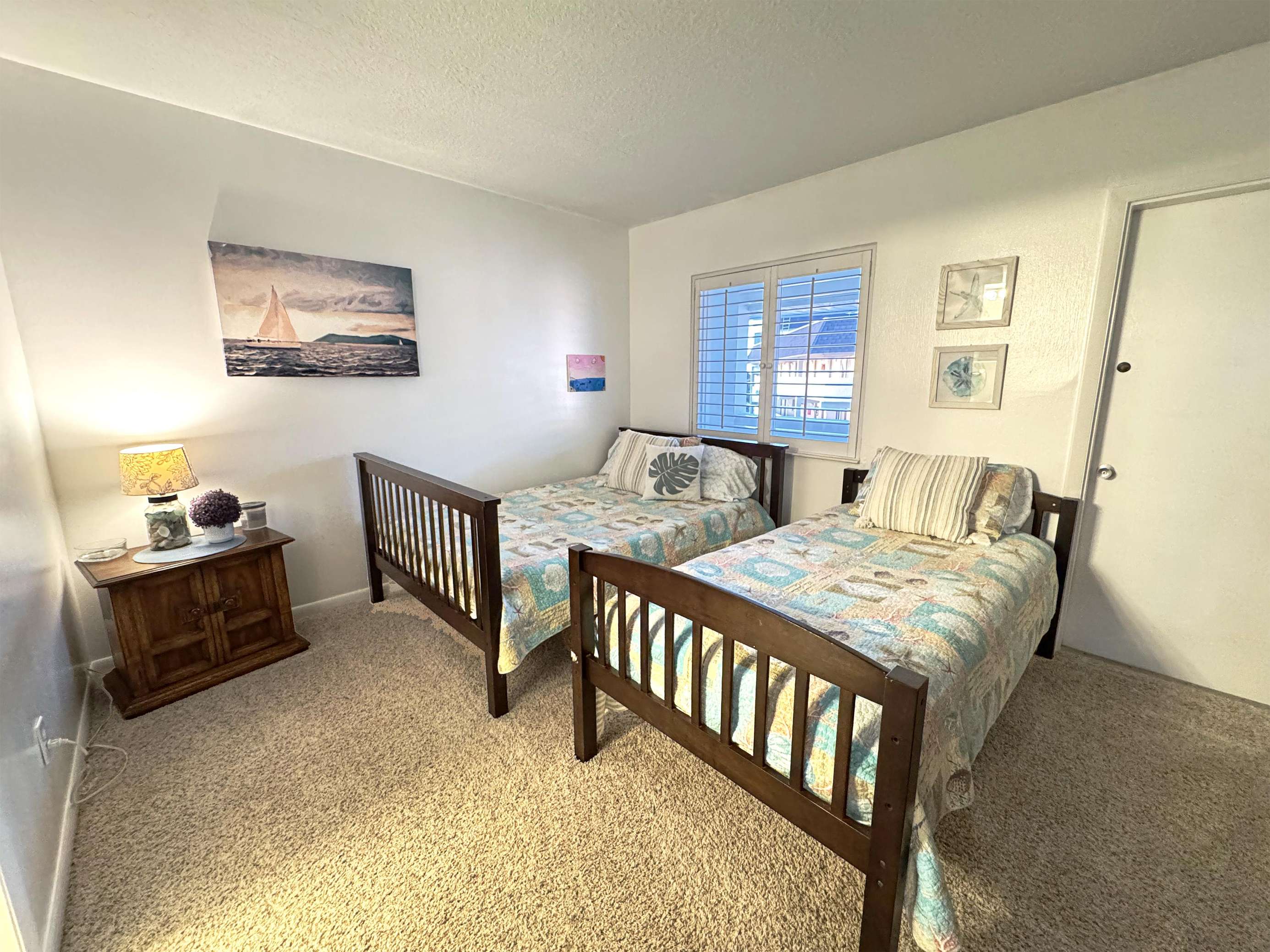 Cozy twin bedroom with soft lighting and serene decor