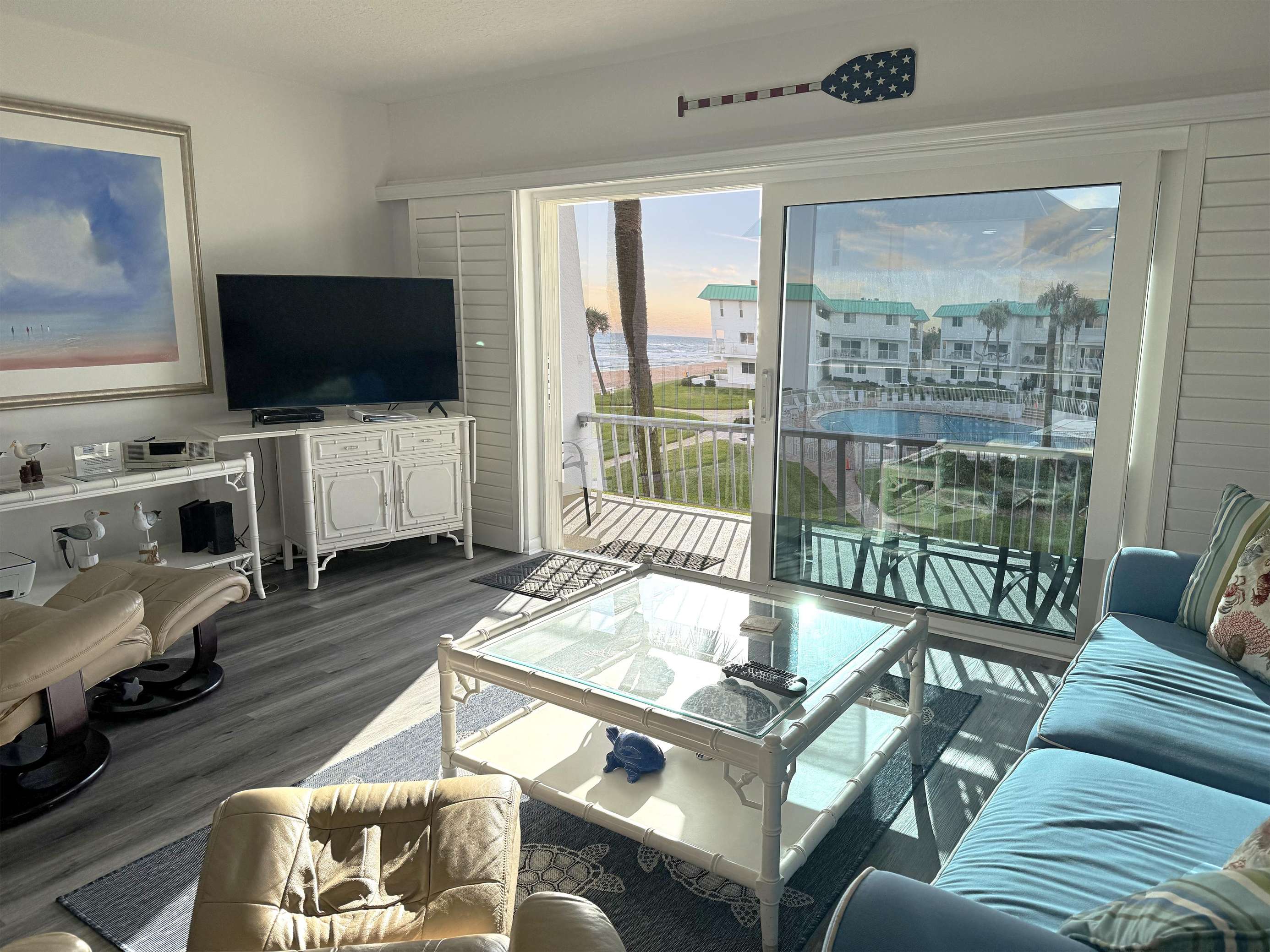 Sunlit living room with cozy seating and balcony views