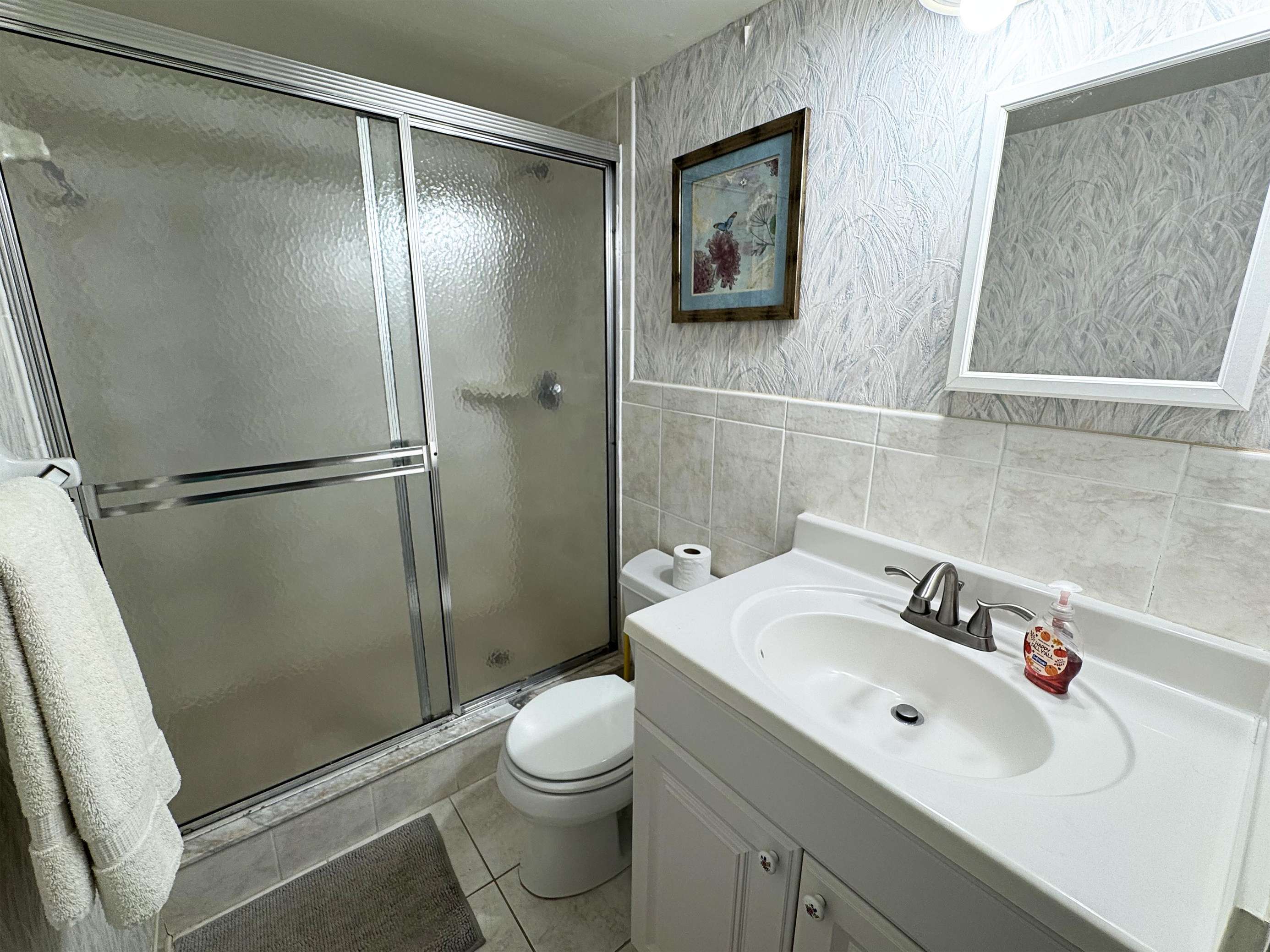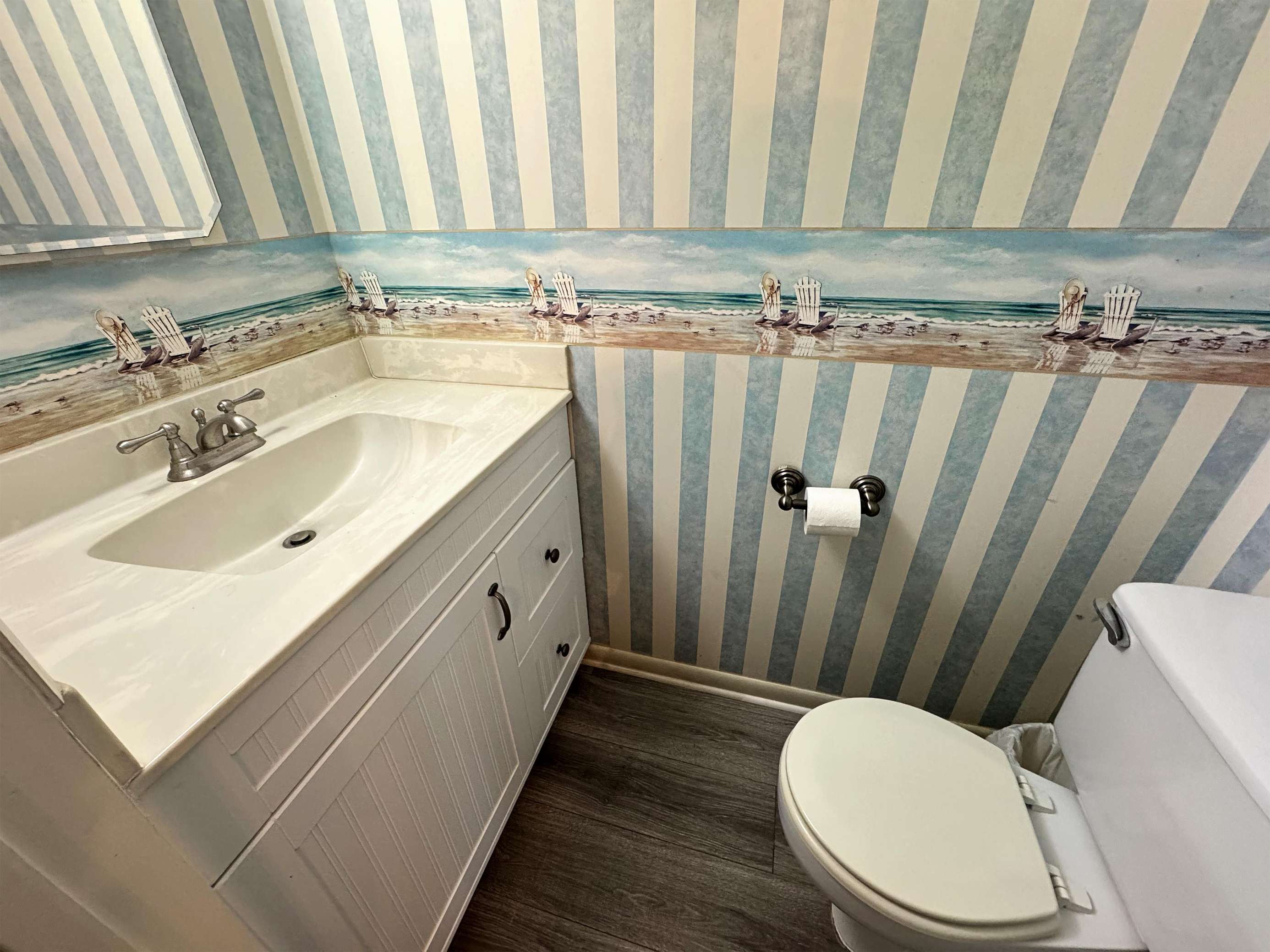 Cozy bathroom with charming coastal wallpaper and modern fixtures