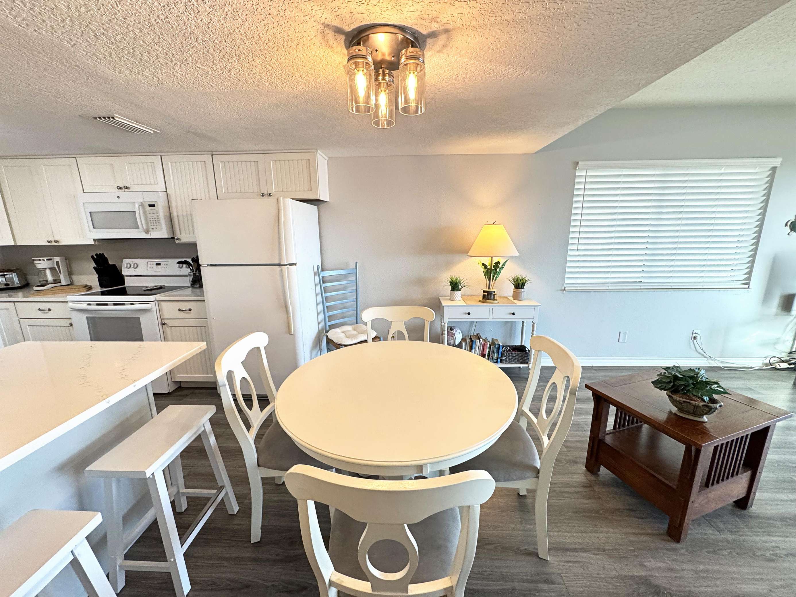 Bright and airy dining area with cozy seating and modern kitchen