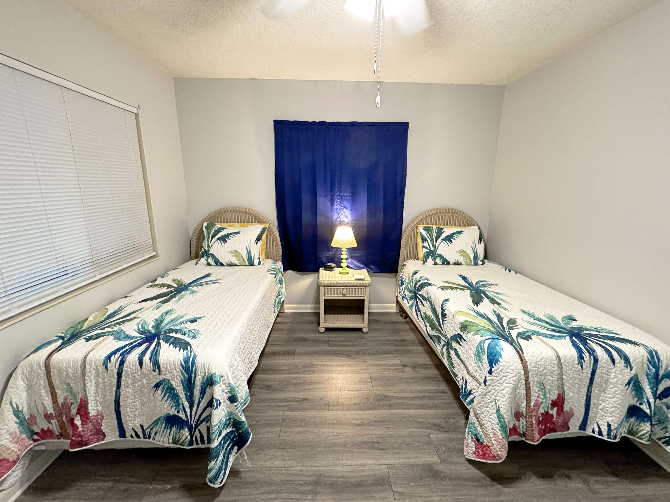 Cozy twin bedroom with tropical-themed bedding and soft lighting