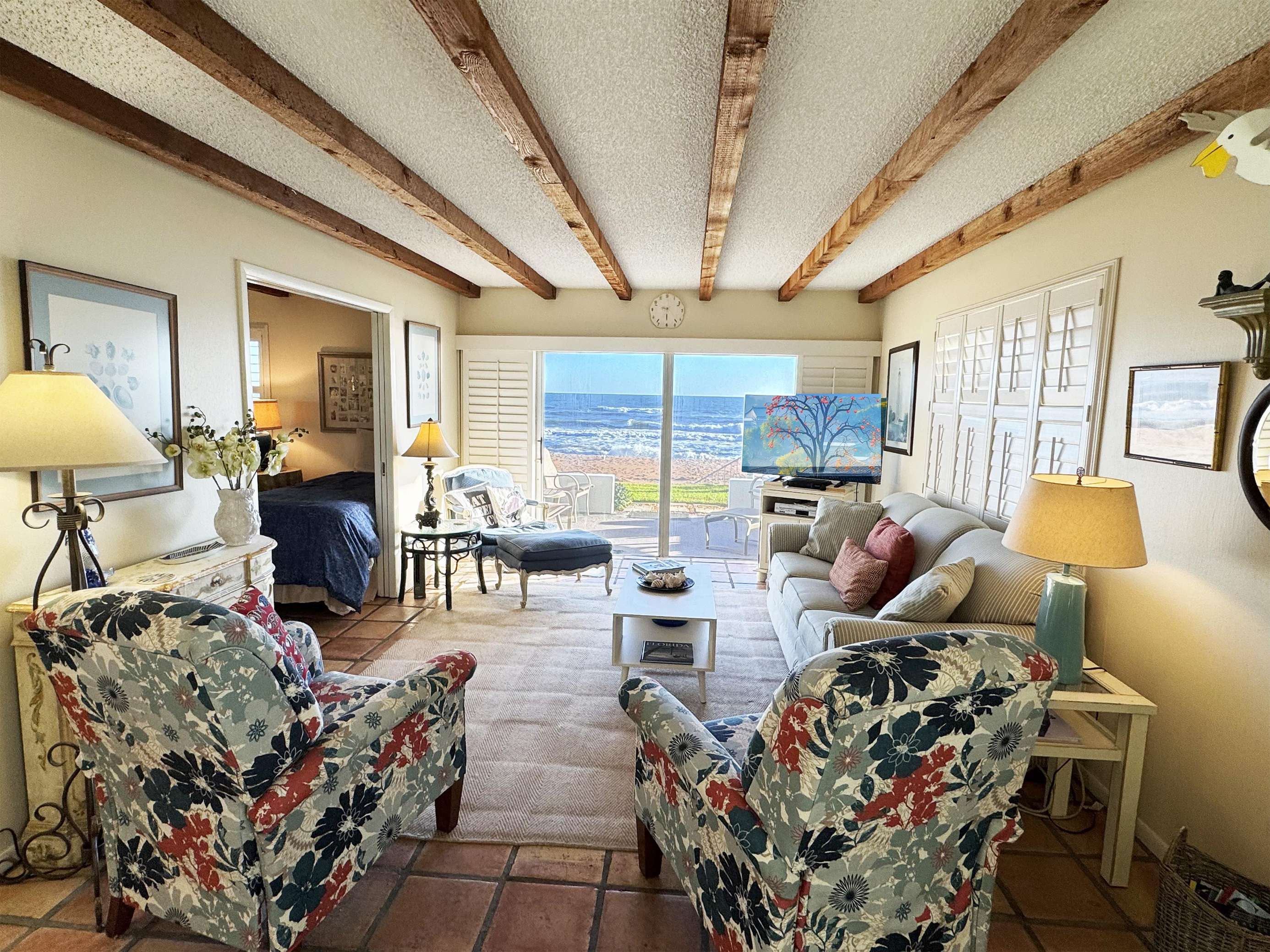 Sunlit living room with ocean views and cozy seating