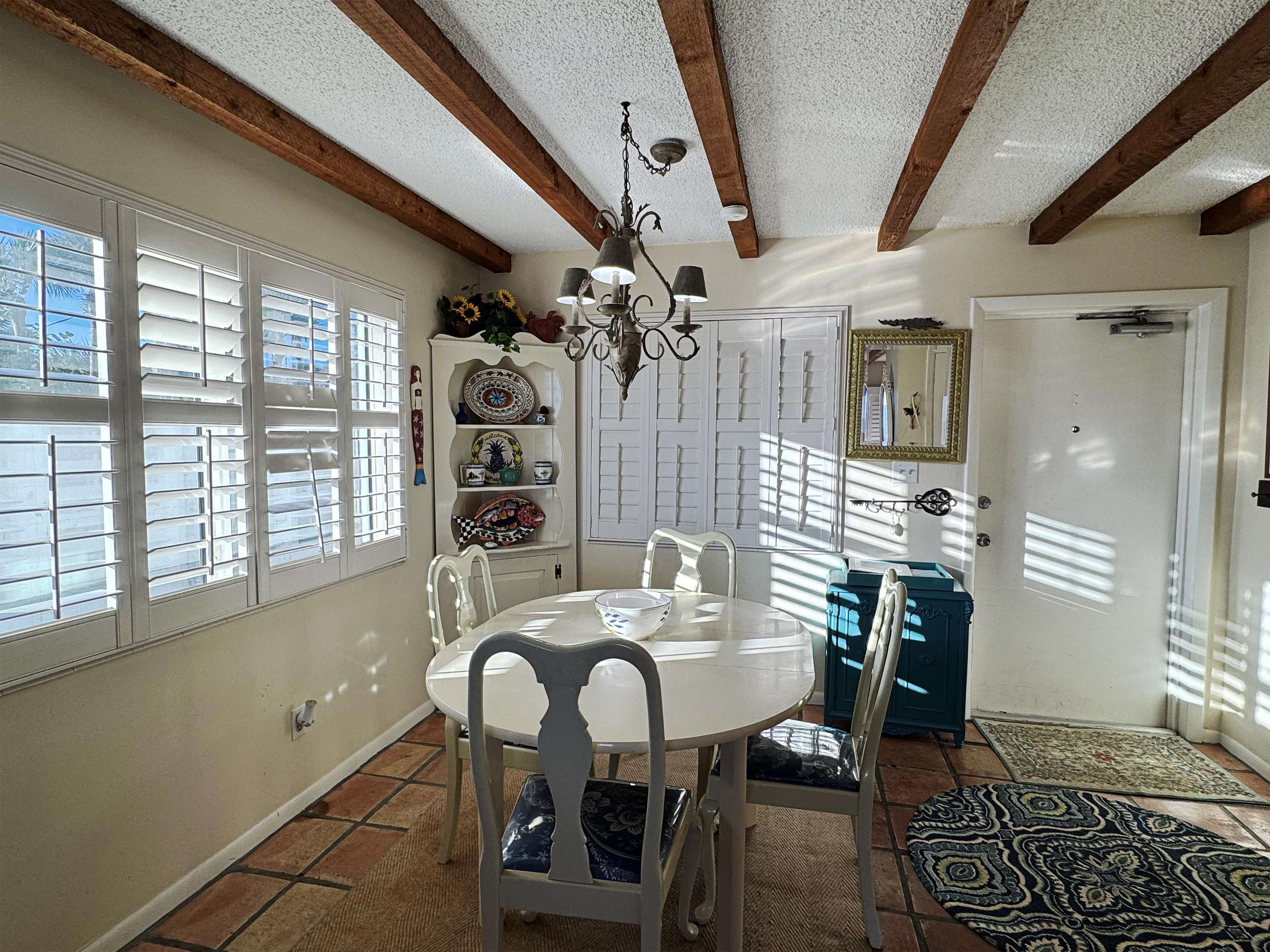 Sunlit dining room with rustic beams and cozy charm