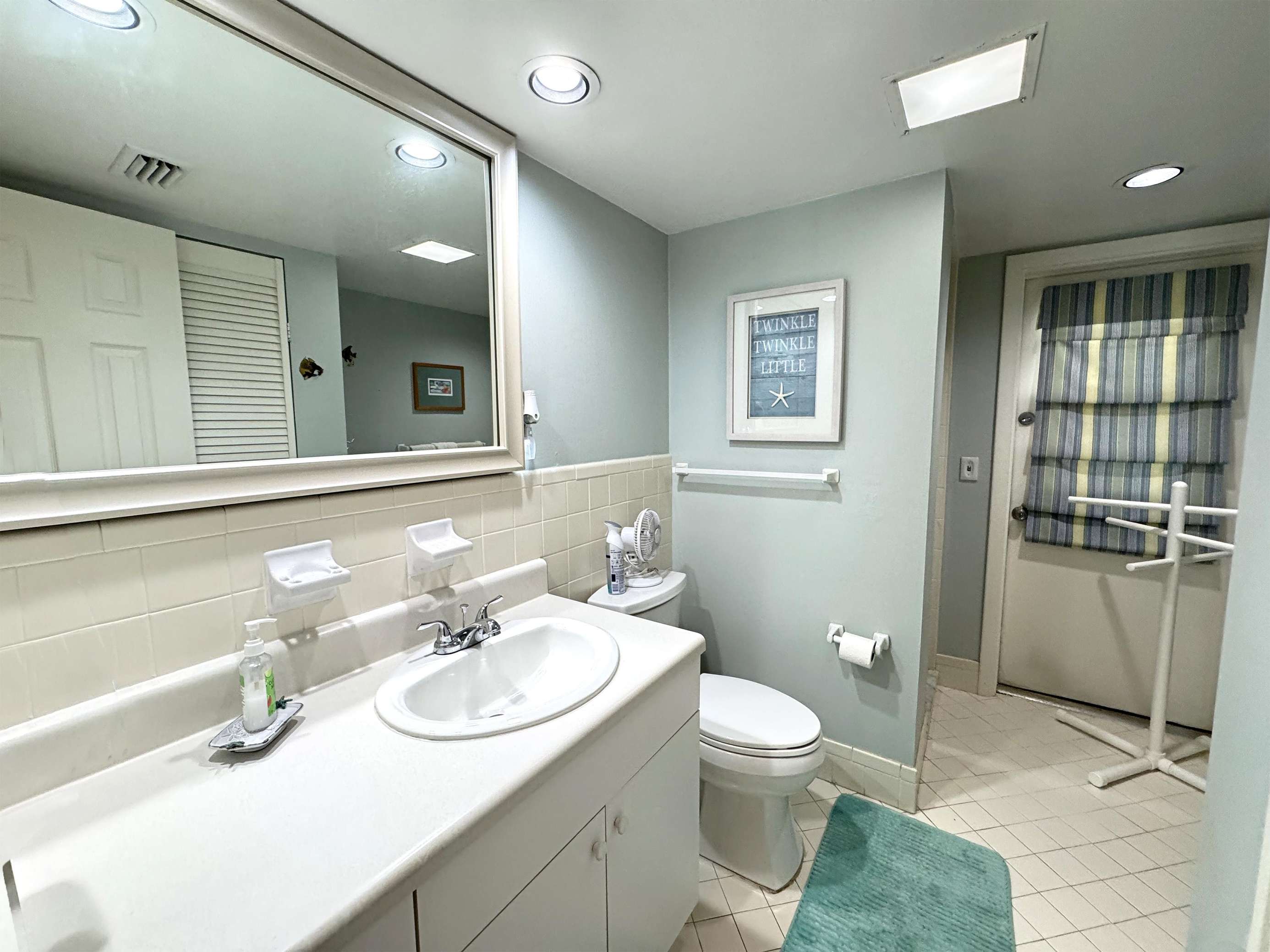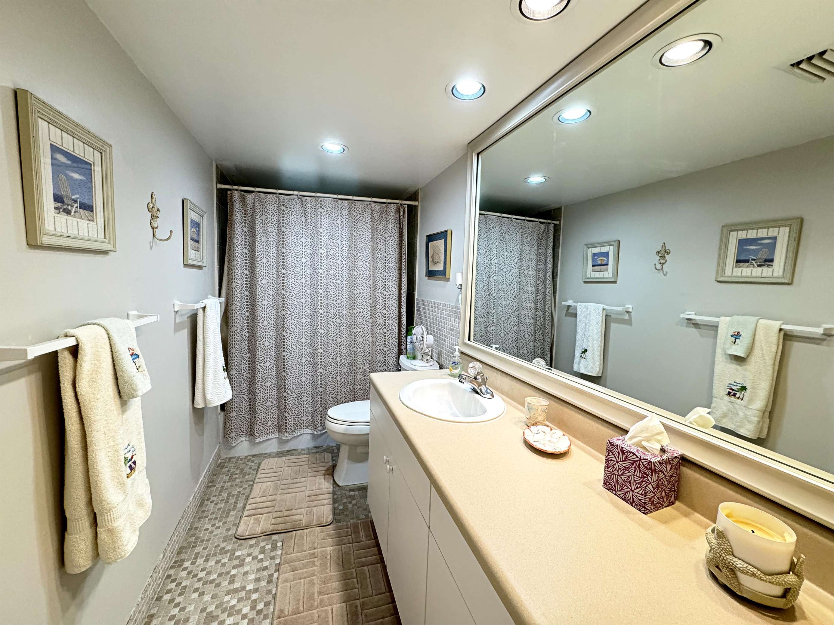 Bright, spacious bathroom with modern amenities and cozy accents