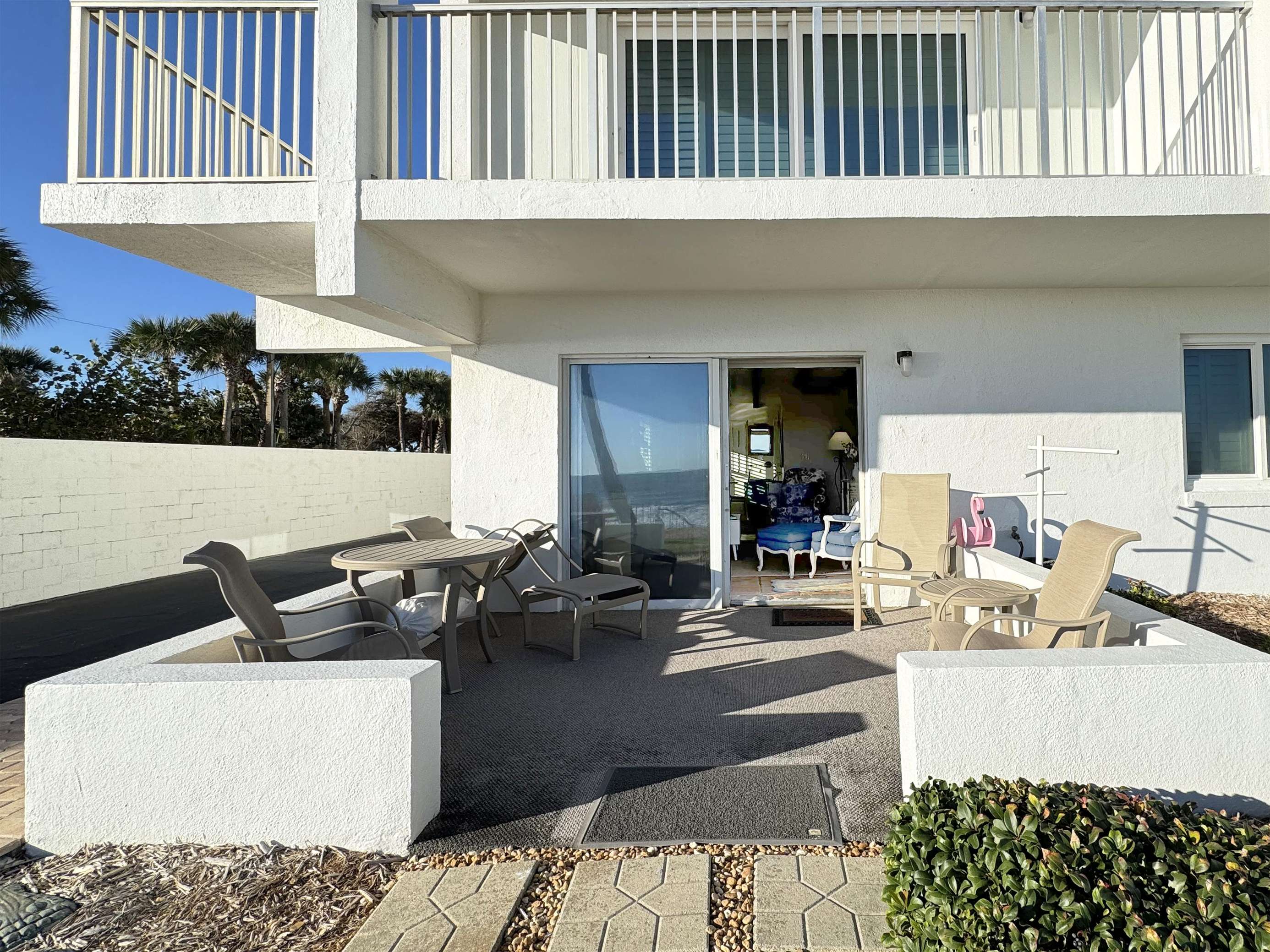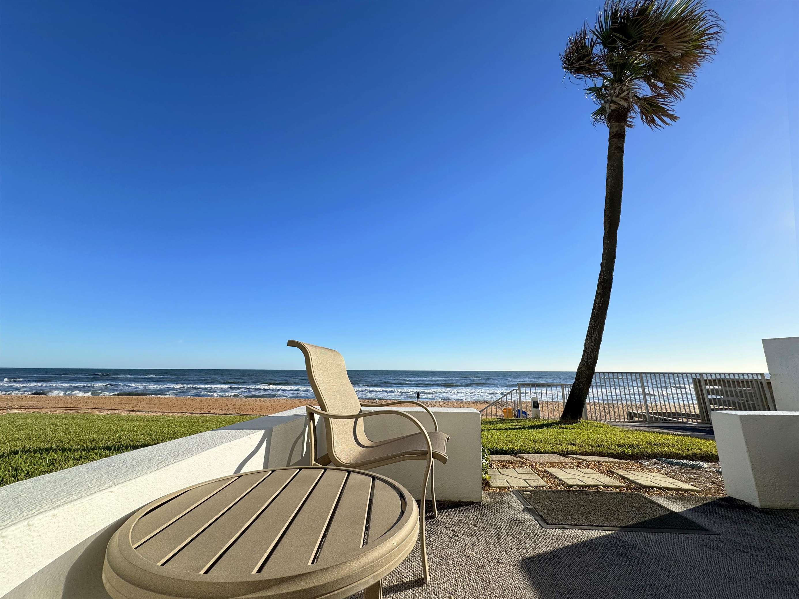Oceanfront patio with stunning beach and palm tree views