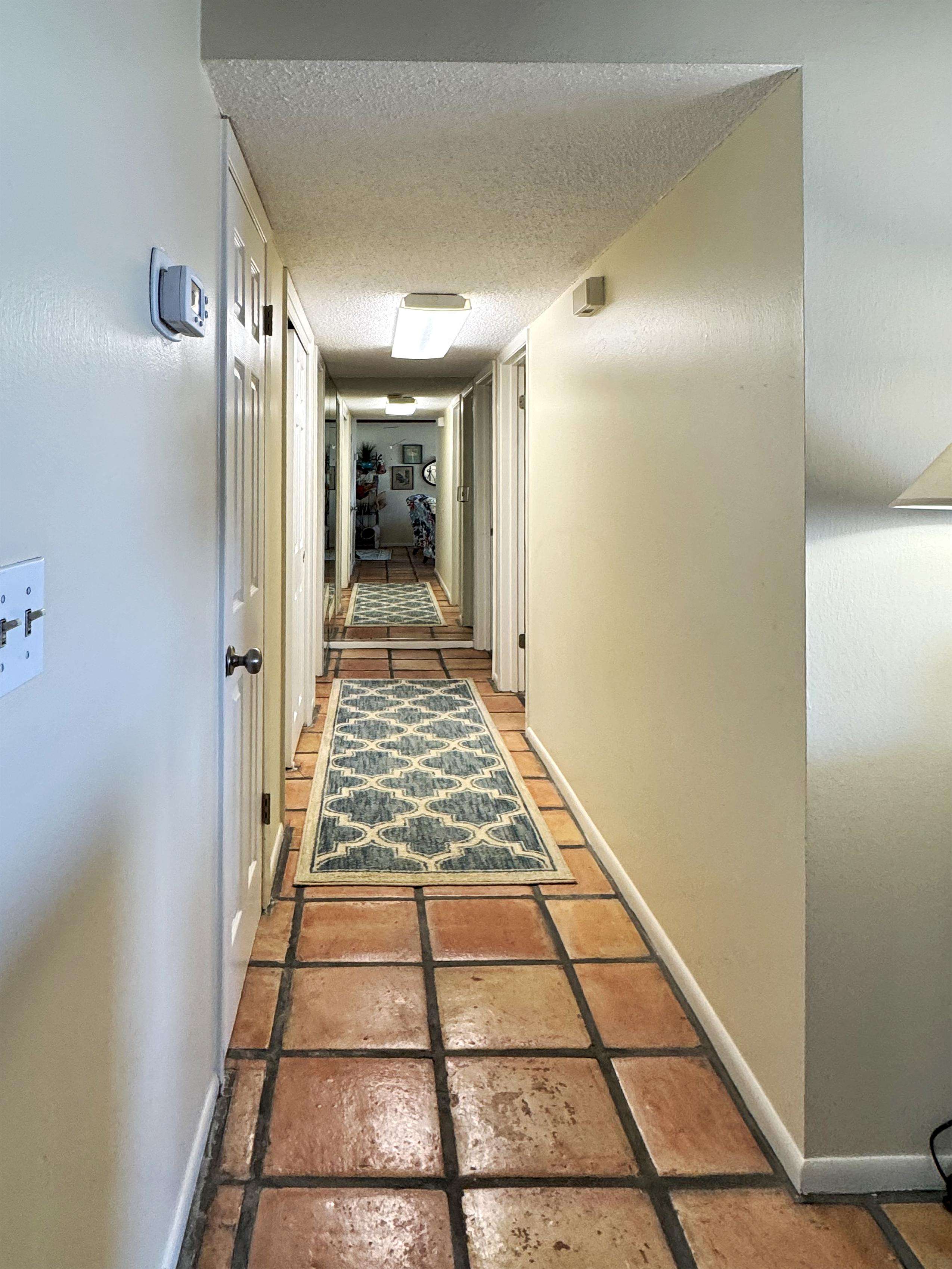 Bright hallway with warm tile flooring and cozy lighting