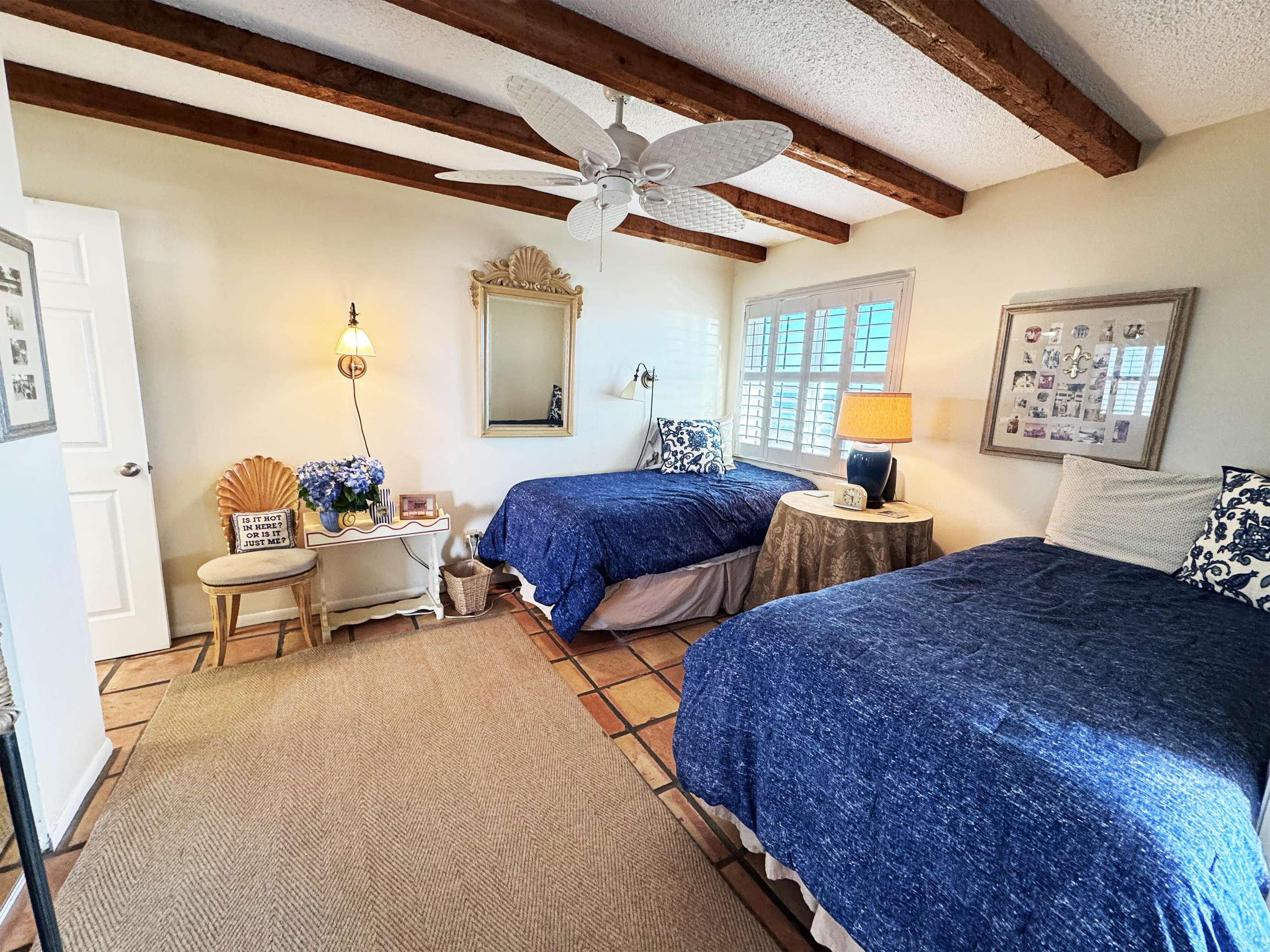 Cozy bedroom with rustic beams and natural light