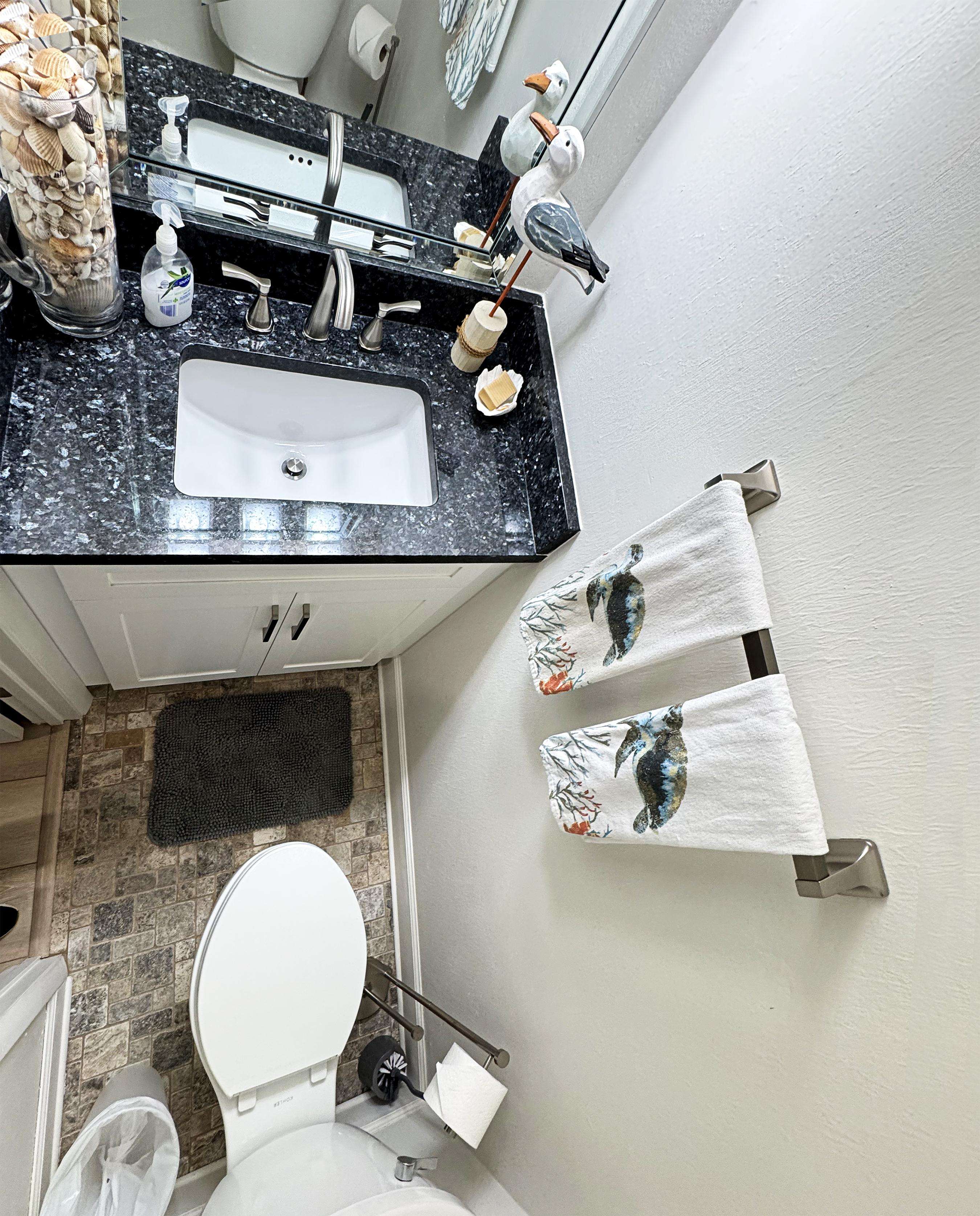 Modern bathroom with sleek black granite countertop and fresh towels