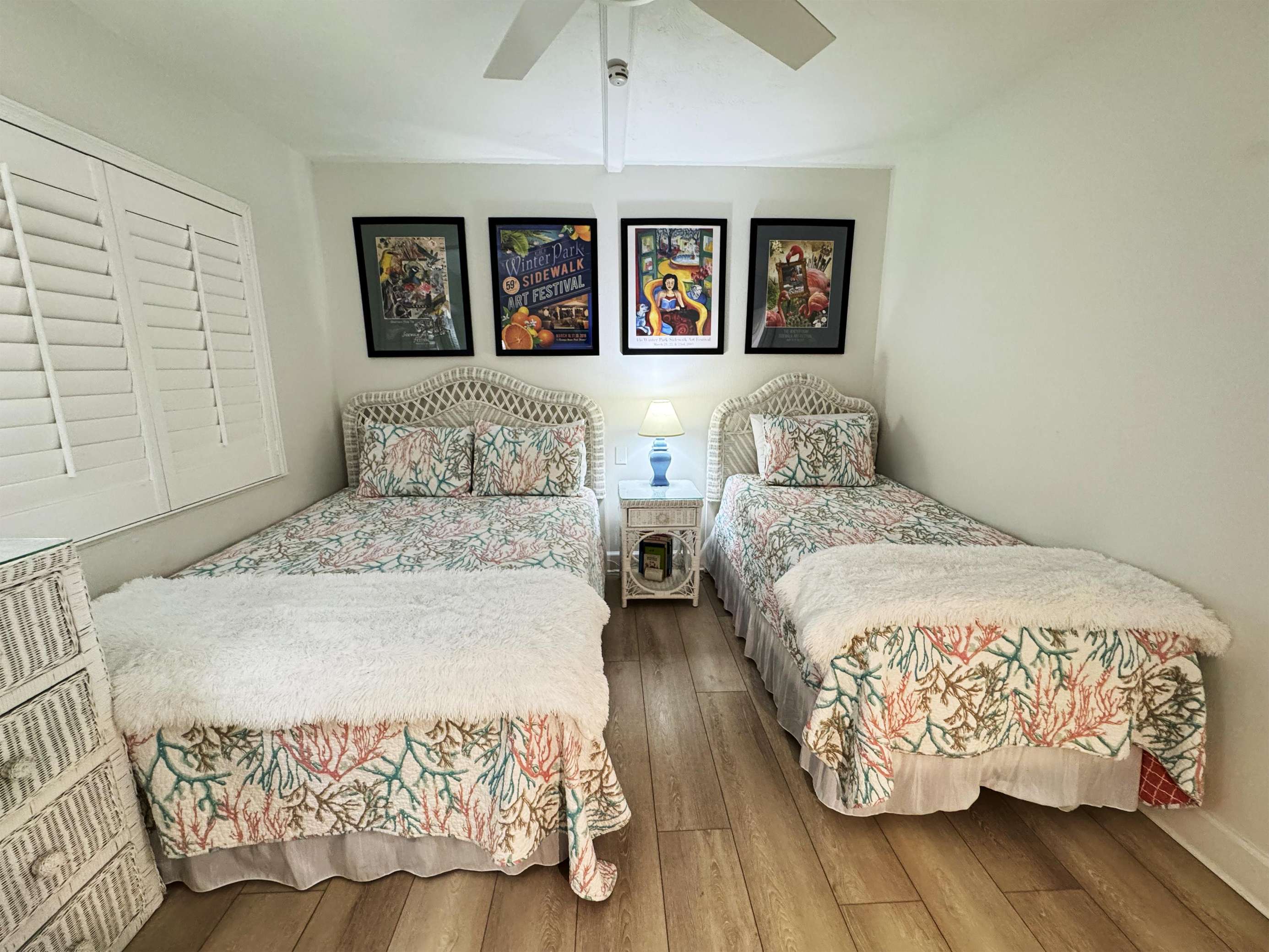 Cozy twin bedroom with charming floral accents and natural light