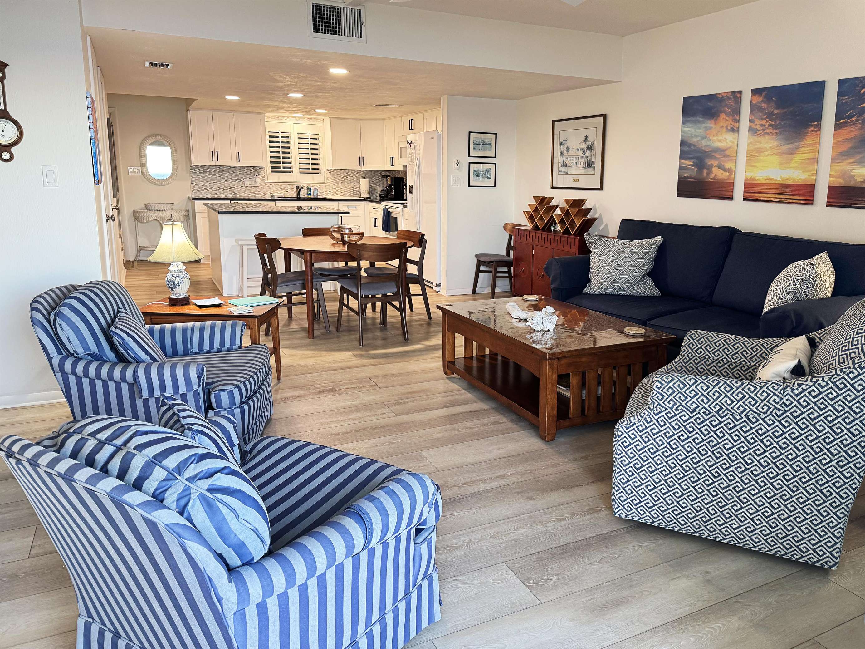 Spacious living room with cozy seating and open kitchen access
