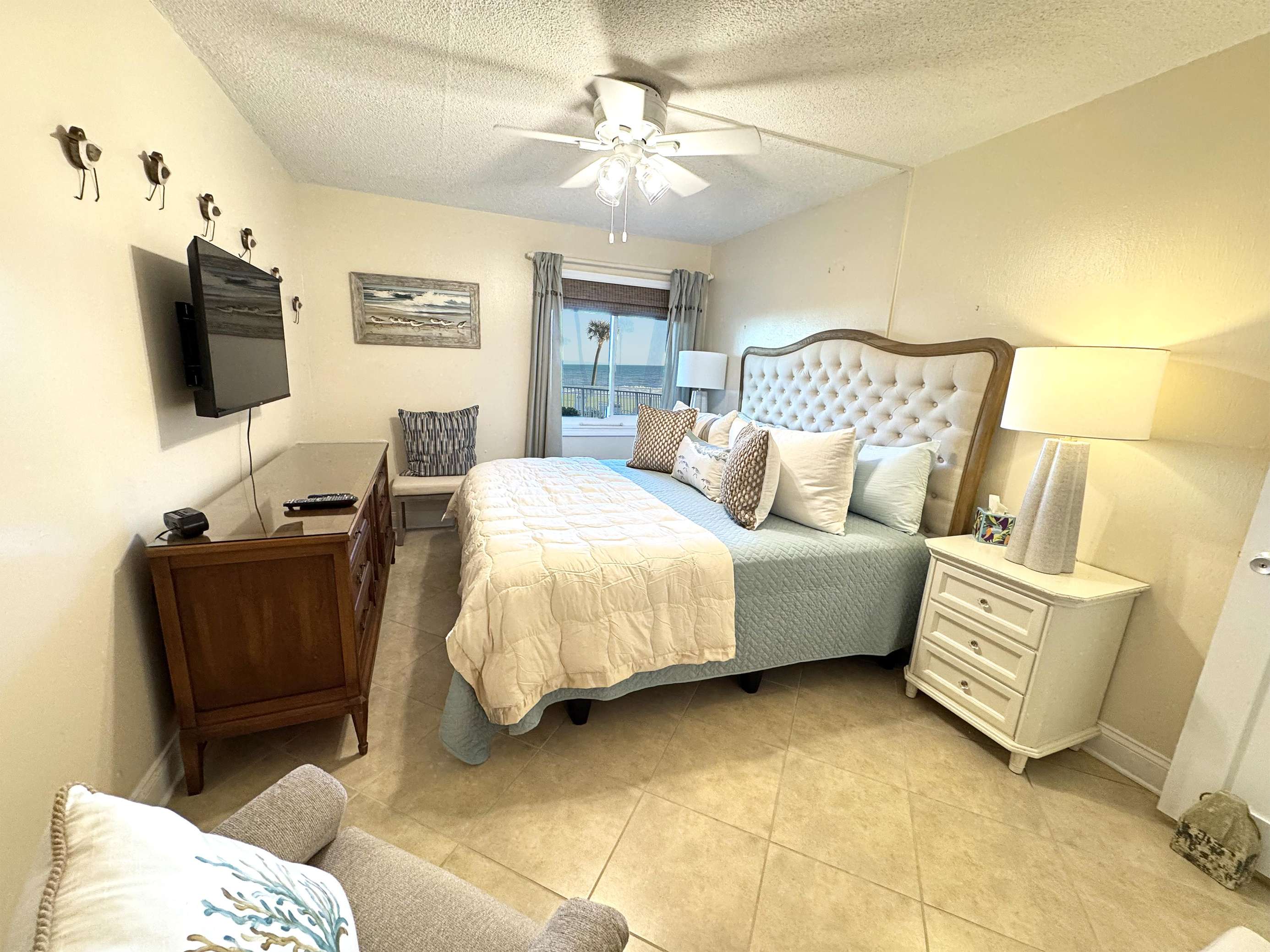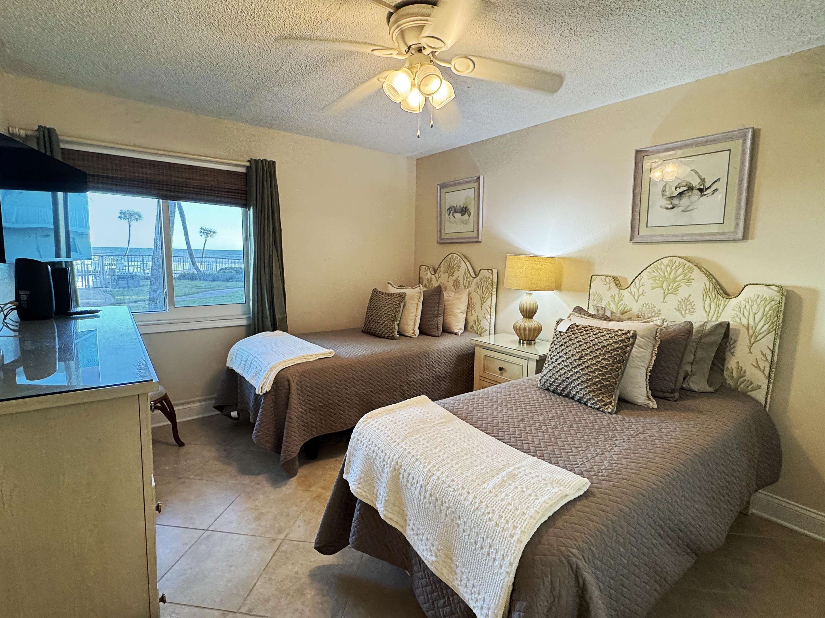 Cozy twin bedroom with serene water views and soft lighting