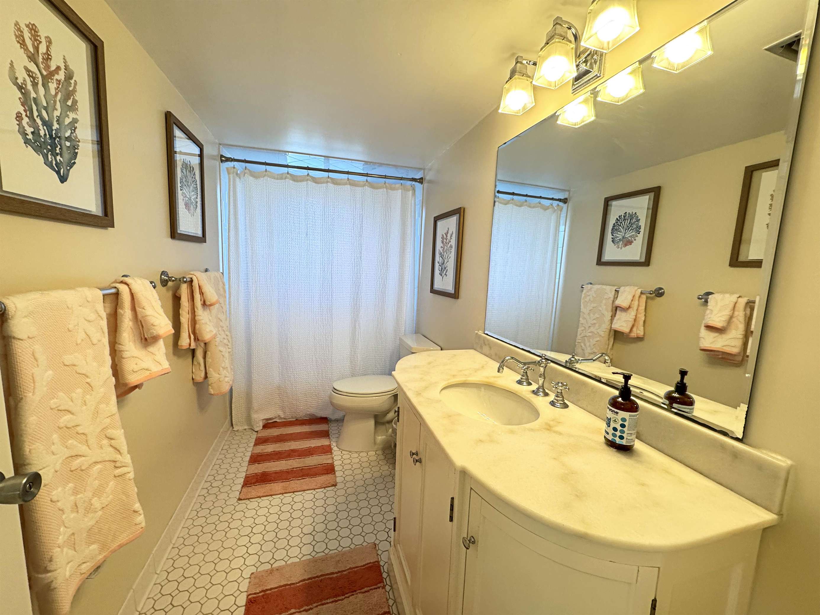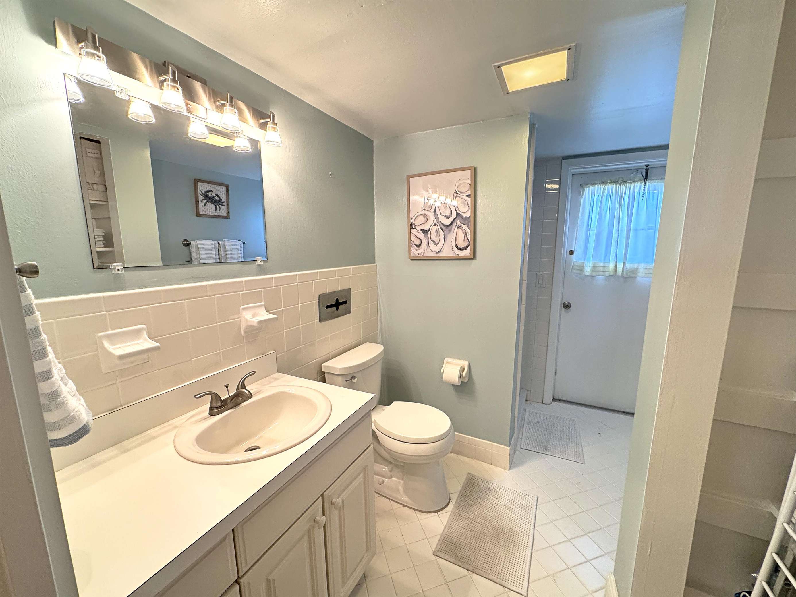 Bright, airy bathroom with spacious vanity and soft lighting